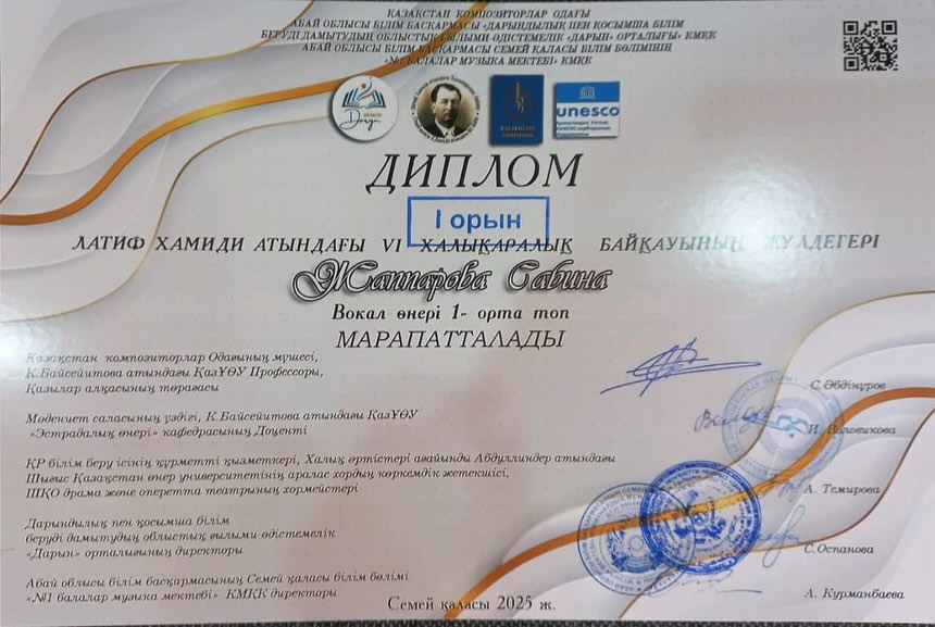 ⚜️18.04.2025 жыл Латиф Хамиди атындағы VI Халықаралық байқау жүлдегерлері мектебіміздің ән үйірмесінің тәрбиеленушілері Жаппарова Сабина және Қаирғазы Торғын. Жетекшісі музыка мұғалімі Нурпейсова Орынгул Серікқызы.